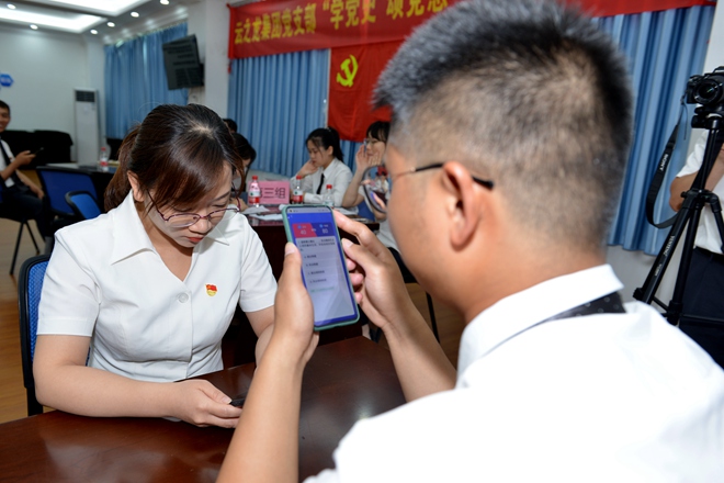 黨史知識對戰賽正式開始,四支隊伍,兩兩對決,搶先答對10題的選手獲勝。在賽前,黨員們已經做好了充足的準備,黨史知識了然于心。在黨史三十問搶答賽中,主持人還未念完題目,選手們便迫不及待搶答。伴隨著每一道題目的問與答,現場的黨員們在答題的節奏中一起重溫了過去100年的崢嶸黨史。