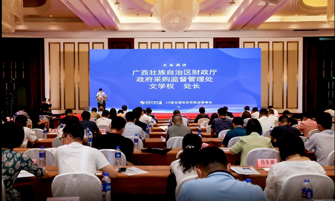 峰會以“強化主體責任·優化營商環境”為主題。廣西壯族自治區財政廳政府采購監督管理處處長文學權以《以政府采購監管“硬約束” 提升營商環境“軟實力”》為題,做主旨演講。