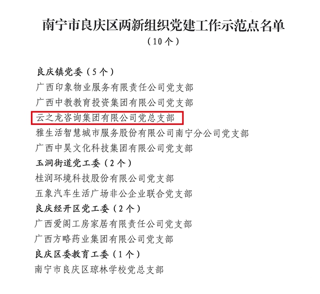 近日,中共南寧市良慶區委員會組織部、中共南寧市良慶區非公有制經濟組織和社會組織工作委員會聯合發布了《關于公布南寧市良慶區兩新組織黨建工作示范點名單的通知》。云之龍黨總支部名列其中,榮獲“南寧市良慶區兩新組織黨建示范點”稱號。