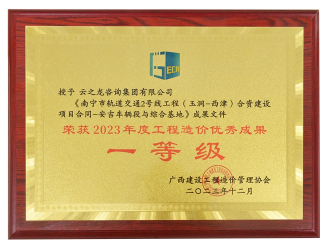 2023年12月26日,廣西建設工程造價管理協會召開了第五屆第五次理事會暨第三次會員代表大會,會議表彰了2023年度優秀工程造價成果。云之龍咨詢集團南寧市軌道交通2號線工程(玉洞~西津)合資建設項目合同-安吉車輛段與綜合基地成果文件榮獲2023年度工程造價優秀成果一等級;三塘體育訓練比賽基地(04-27地塊)項目成果文件榮獲2023年度工程造價優秀成果三等級。此外,胡冬梅獲得廣西建設工程造價管理協會優秀個人。