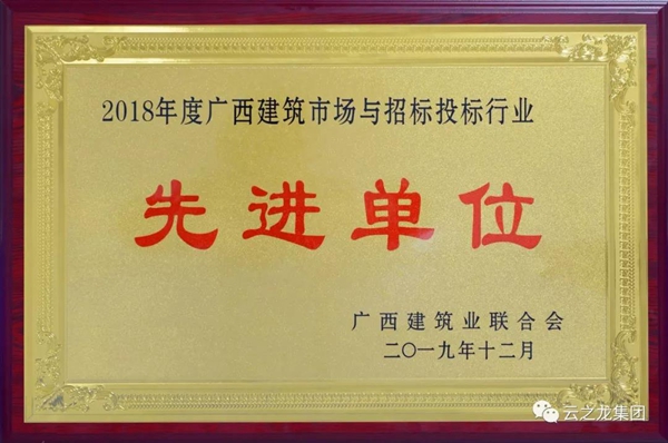 云之龍集團再次被評為“2018年度廣西建筑市場與招標投標行業先進單位”,這是集團連續第九年獲得此殊榮。此外,集團項目經理韋成曉獲得“先進個人”稱號。