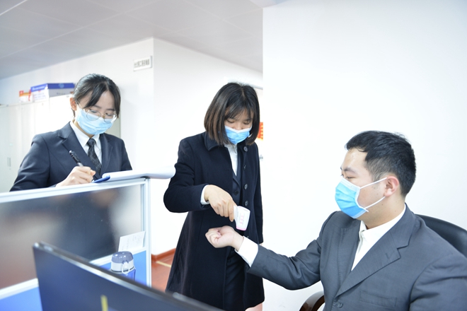 我們根據集團要求,準備了足夠的口罩、84消毒液、酒精、額溫槍、一次性手套等防疫用品;在開工前,對員工14天內的行程及接觸信息排查;辦公室每天都會用消毒液進行消毒,用酒精擦桌子、門把等位置;所有工作人員每天進行兩次(上午、下午)測量體溫,并全程戴好口罩;食堂里分批就餐。